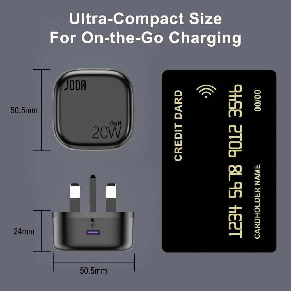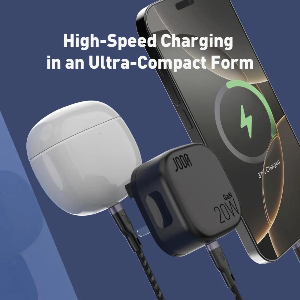 شاحن JODA GaN بقوة 20 واط يقدم لك أداء عالي وسرعة شحن مذهلة في تصميم صغير لا يتجاوز حجم بطاقة البنك. مصنوع بتقنية GaN المتطورة التي تضمن كفاءة عالية وتوليد حرارة أقل، ليكون خيارك الذكي في كل مكان.
