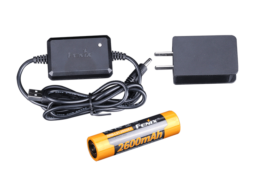 - كشاف فينكس LD22 V2.0 مزود ببطارية ليثيوم أيون من طراز FENIX ARB-L21-2600EX، مما يوفر طاقة لفترة طويلة الأمد.